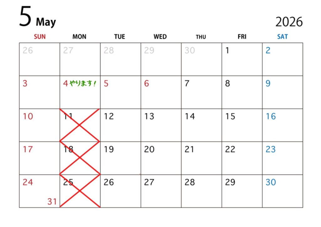 2026.03.04(水)2026年5月営業日のお知らせ5月の営業カレンダーです! 5/4は月曜ですが営業日になります!よろしくお願いします!!2026年5月 2026年3月・4月営業日のお知らせ 一覧を見る 月別の一覧2026年3月 (1)2月 (1)1月 (1)2025年12月 (1)11月 (4)10月 (3)9月 (3)8月 (4)7月 (4)6月 (1)3月 (1)1月 (1)2024年12月 (1)11月 (1)9月 (2)6月 (1)5月 (1)4月 (2)2月 (2)1月 (1)2023年12月 (1)10月 (1)8月 (1)7月 (1)5月 (1)4月 (2)2月 (1)1月 (1)